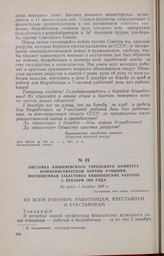 Главная Листовки коммунистического подполья Бессарабии. 1918-1940 Документы Листовка Кишиневского городского комитета Коммунистической партии Р...