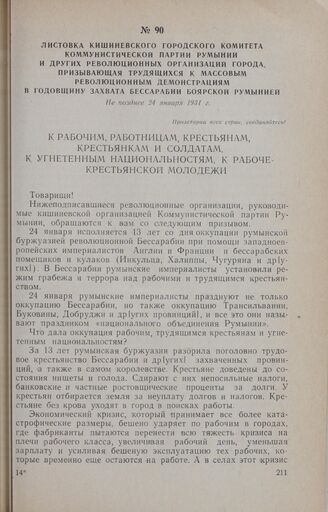 Листовка Кишиневского городского комитета Коммунистической партии Румынии и других революционных организаций города, призывающая трудящихся к массовым революционным демонстрациям в годовщину захвата Бессарабии боярской Румынией. Не позднее 24 января 1931 г. // ЦГА МССР, ф. 664, оп. 1, д. 2. л. 559, типографский оттиск.