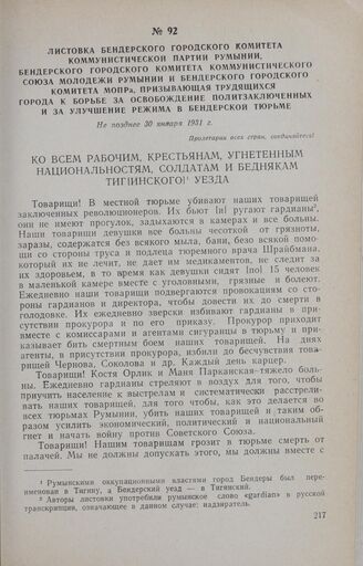 Листовка Бендерского городского комитета Коммунистической партии Румынии, Бендерского городского комитета Коммунистического Союза Молодежи Румынии и Бендерского городского комитета МОПРа, призывающая трудящихся города к борьбе за освобождение политзаключенных и за улучшение режима в бендерской тюрьме. Не позднее 30 января 1931 г. // ЦГА МССР, ф. 173, оп. 1, д. 17, л. 82, типографский оттиск.