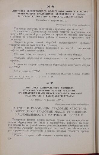 Листовка Бессарабского областного комитета МОПРа, призывающая трудящихся Бессарабии к борьбе за освобождение политических заключенных. Не позднее 4 февраля 1931 г.