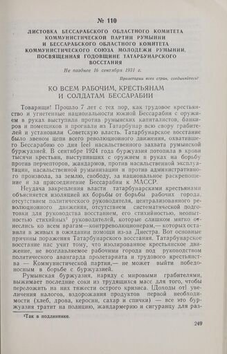 Листовка Бессарабского областного комитета Коммунистической партии Румынии и Бессарабского областного комитета Коммунистического Союза Молодежи Румынии, посвященная годовщине Татарбунарского восстания. Не позднее 16 сентября 1931 г.