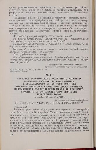 Листовка Бессарабского областного комитета Коммунистической партии Румынии и Бессарабского областного комитета Коммунистического Союза Молодежи Румынии, призывающая солдат и трудящихся не принимать участия в строительстве стратегических шоссейных дорог. Не позднее 17 сентября 1931 г. // ЦГА МССР, ф. 738, оп. 1, д. 4845, л. 67, ротаторный оттиск.
