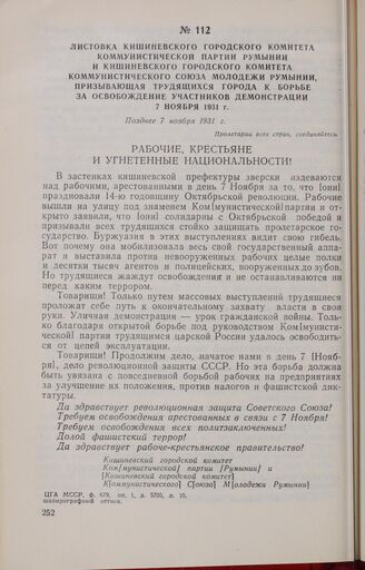 Листовка Кишиневского городского комитета Коммунистической партии Румынии и Кишиневского городского комитета Коммунистического Союза Молодежи Румынии, призывающая трудящихся города к борьбе за освобождение участников демонстрации 7 ноября 1931 г. Не ранее 7 ноября 1931 г. // ЦГА МССР, ф. 679, оп. 1. д. 5705, л. 10, шапирографный оттиск.