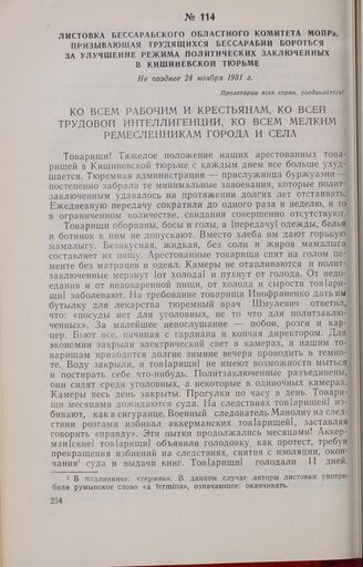 Листовка Бессарабского областного комитета МОПРа, призывающая трудящихся Бессарабии бороться за улучшение режима политических заключенных в кишиневской тюрьме. Не позднее 24 ноября 1931 г.