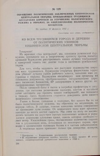 Обращение политических заключенных Кишиневской центральной тюрьмы, призывающее трудящихся Бессарабии бороться за улучшение политического режима в тюрьмах, за аннулирование политических процессов. Не позднее 22 февраля 1932 г. // ЦГА МССР, ф. 679, оп. 1, д. 5972, л. 268-270, ротаторный оттиск.