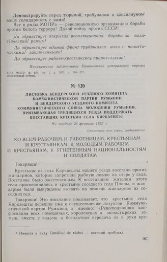 Листовка Бендерского уездного комитета Коммунистической партии Румынии и Бендерского уездного комитета Коммунистического Союза Молодежи Румынии, призывающая трудящихся уезда поддержать восставших крестьян села Киркаешты. Не позднее 26 февраля 1932 г.