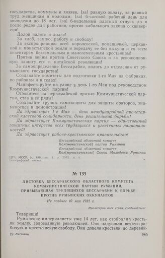 Листовка Бессарабского областного комитета Коммунистической партии Румынии, призывающая трудящихся Бессарабии к борьбе против румынских оккупантов. Не позднее 10 мая 1932 г.