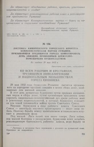 Листовка Кишиневского городского комитета Коммунистической партии Румынии, призывающая трудящихся города бойкотировать день авиации, проводимый буржуазно-помещичьим правительством. Не позднее 29 мая 1932 г. // ЦГА МССР, ф. 173. оп. 1, д. 17, л. 547, перевод с румынского.