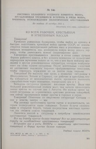 Листовка Бельцкого уездного комитета МОПРа, призывающая трудящихся вступать в ряды МОПРа, требовать освобождения политических арестованных. Не позднее 18 октября 1932 г.