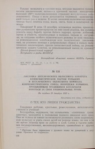 Листовка Бессарабского областного комитета Коммунистической партии Румынии и Бессарабского областного комитета Коммунистического Союза Молодежи Румынии, призывающая трудящихся Бессарабии бороться за свои национальные права. Не позднее 20 декабря 1932 г. // ЦГА МССР, ф. 173, оп. 1, д. 17, л. 820, перевод с румынского.