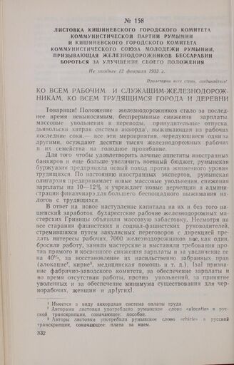 Листовка Кишиневского городского комитета Коммунистической партии Румынии и Кишиневского городского комитета Коммунистического Союза Молодежи Румынии, призывающая железнодорожников Бессарабии бороться за улучшение своего положения. Не позднее 12 февраля 1933 г. // ЦГА МССР, ф. 680, оп. 1, д. 3601, л. 149, ротаторный оттиск.