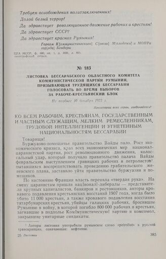 Листовка Бессарабского областного комитета Коммунистической партии Румынии, призывающая трудящихся Бессарабии голосовать во время выборов за Рабоче-крестьянский блок. Не позднее 10 декабря 1933 г.