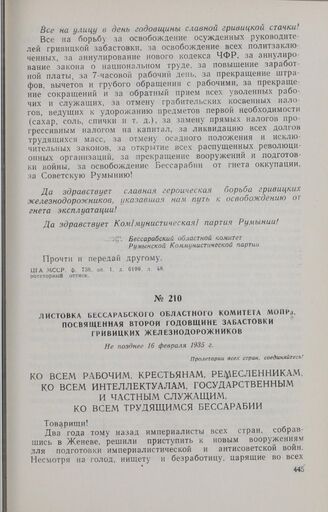 Листовка Бессарабского областного комитета МОПРа, посвященная второй годовщине забастовки гривицких железнодорожников. Не позднее 16 февраля 1935 г.