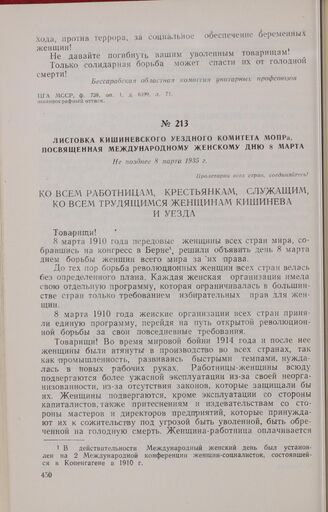 Листовка Кишиневского уездного комитета МОПРа, посвященная Международному женскому дню 8 марта. Не позднее 8 марта 1935 г. // ЦГА МССР, ф. 738, оп. 1, д. 6199, л. 96, ротаторный оттиск.