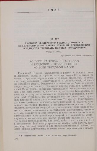 Листовка Бендерского уездного комитета Коммунистической партии Румынии, призывающая трудящихся требовать помощи голодающим. Февраль 1936 г.