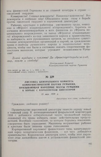 Листовка Центрального Комитета Коммунистической партии Румынии, призывающая народные массы Румынии к борьбе с королевской диктатурой. 15 мая 1939 г. // ЦГА МССР, ф. 680, оп. 1. д. 3833, л. 141, типографский оттиск, перевод с румынского.