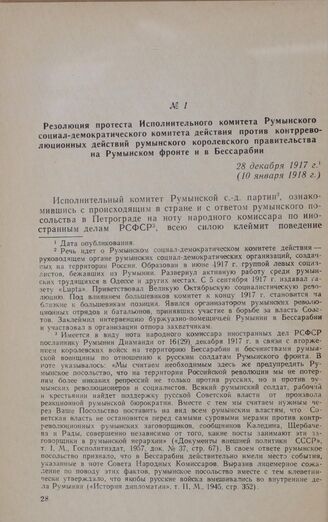 Резолюция протеста Исполнительного комитета Румынского социал-демократического комитета действия против контрреволюционных действий румынского королевского правительства на Румынском фронте и в Бессарабии. 26 декабря 1917 г. (10 января 1918 г.) // «Правда», № 224 (155), 28 декабря 1917 г. (10 января 1918 г.).