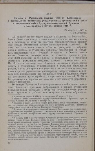 Из отчета Румынской группы РКП(б) Коминтерну о деятельности румынских революционных организаций в связи с вторжением войск буржуазно-помещичьей Румынии в Бессарабию в начале января 1918 года. 23 апреля 1919 г. // ЦПА ИМЛ. Копия. Перевод с французского языка.