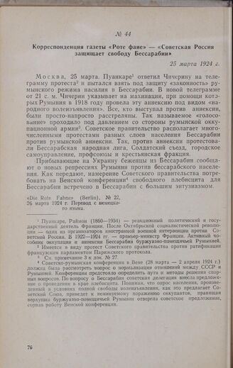 Корреспонденция газеты «Роте фане» — «Советская Россия защищает свободу Бессарабии». 25 марта 1924 г. // «Die Rote Fahne» (Berlin), № 22, 26 марта 1924 г. Перевод с немецкого языка.