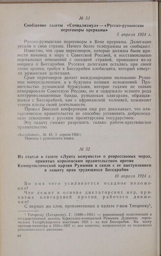 Из статьи в газете «Лупта комунистэ» о репрессивных мерах, принятых королевским правительством против Коммунистической партии Румынии в связи с ее выступлением в защиту прав трудящихся Бессарабии. 10 апреля 1924 г. // «Lupta comunistă», № 1, 10 апреля 1924 г. Опубл. в сб. «Documente din istoria Partidului Comunist din România», vol. II, Bucureşti, 1953, стр. 175-176. Перевод с румынского языка.