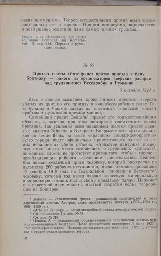 Протест газеты «Роте фане» против приезда в Вену Братиану — одного из организаторов зверских расправ над трудящимися Бессарабии и Румынии. 5 октября 1924 г.