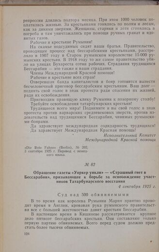 Обращение газеты «Уоркер уикли» — «Страшный гнет в Бессарабии», призывающее к борьбе за освобождение участников Татарбунарского восстания. 4 сентября 1925 г. // «The Workers Weekly» (London), № 135, 4 сентября 1925 г. Перевод с английского языка.
