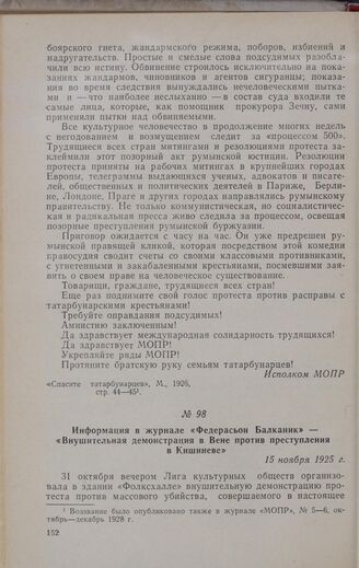 Информация в журнале «Федерасьон Балканик» — «Внушительная демонстрация в Вене против преступления в Кишиневе». 15 ноября 1925 г.
