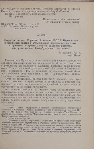 Открытое письмо Норвежской секции МОПР Норвежской крестьянской партии и Объединению норвежских крестьян с призывом к протесту против судебной расправы над участниками Татарбунарского восстания. 21 ноября 1925 г.