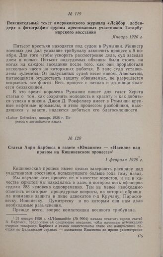 Статья Анри Барбюса в газете «Юманите» — «Насилие над правом на Кишиневском процессе». 1 февраля 1926 г. // «L’Humanité», № 9915, 1 февраля 1926 г. Перевод с французского языка.