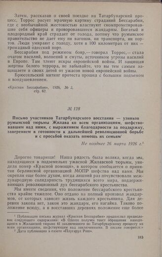 Письмо участников Татарбунарского восстания — узников румынской тюрьмы Жилава ко всем организациям, шефствовавшим над ними, с выражением благодарности за поддержку, заверением в готовности к дальнейшей революционной борьбе и просьбой оказать помощь их семьям. Не позднее 26 марта 1926 г. // «Красная Бессарабия», 1926, № 2, стр. 47.