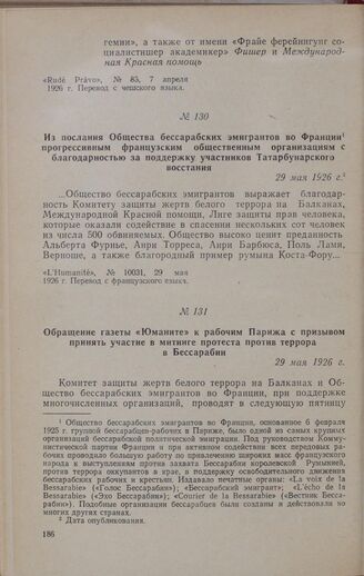 Из послания Общества бессарабских эмигрантов во Франции прогрессивным французским общественным организациям с благодарностью за поддержку участников Татарбунарского восстания. 29 мая 1926 г. // «L’Humanité», № 10031, 29 мая 1926 г. Перевод с французского языка.