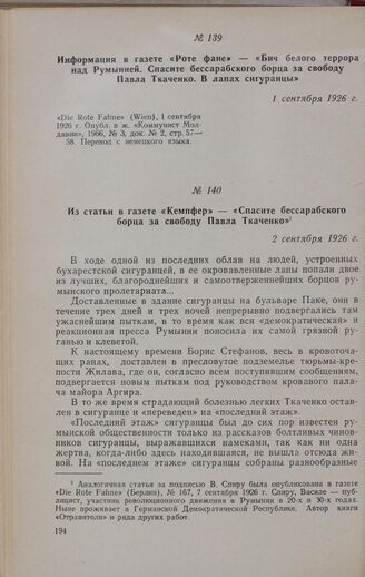 Информация в газете «Роте фане» — «Бич белого террора над Румынией. Спасите бессарабского борца за свободу Павла Ткаченко. В лапах сигуранцы». 1 сентября 1926 г. // «Die Rote Fahne» (Wien), 1 сентября 1926 г. Опубл. в ж. «Коммунист Молдавии», 1966, № 3, док. № 2, стр. 57-58. Перевод с немецкого языка.