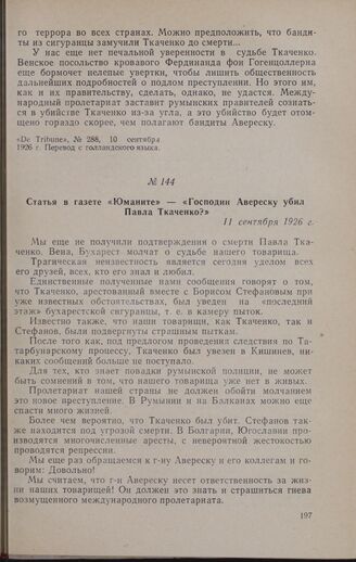 Статья в газете «Юманите» — «Господин Авереску убил Павла Ткаченко?» 11 сентября 1926 г. // «L’Humanité», № 10136, 11 сентября 1926 г. Перевод с французского языка.