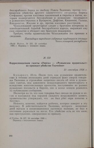Корреспонденция газеты «Унита» — «Румынское правительство признает убийство Ткаченко». 23 сентября 1926 г. // «L’Unita», № 227, 24 сентября 1926 г. Перевод с итальянского языка.