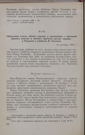 Обращение газеты «Дейли уоркер» к трудящимся с призывом принять участие в митинге протеста против террора в Румынии и убийства П. Ткаченко. 14 октября 1926 г. // «The Daily Worker» (USA), № 233, 15 октября 1926 г. Перевод с английского языка.