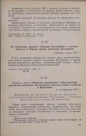 Статья в газете «Ромыния мунчитоаре» — «Преступления румынской олигархии. Бессарабских крестьян отдают в рабство в Бразилию». 1-14 февраля 1927 г. // «România muncitoare», 1-14 февраля 1927 г. Перевод с румынского языка.