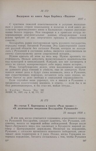 Из статьи Т. Бартошека в газете «Руде право» — «К десятилетию оккупации Бессарабии Румынией». 22 января 1928 г. // «Rudé Ргávо», № 19, 22 января 1928 г. Перевод с чешского языка.