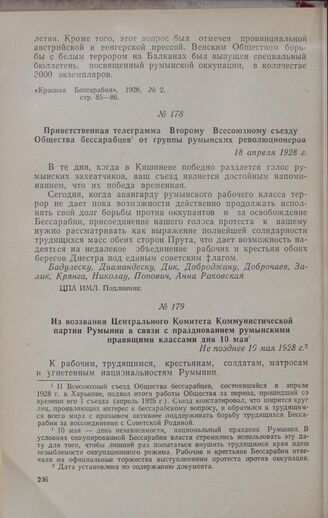 Из воззвания Центрального Комитета Коммунистической партии Румынии в связи с празднованием румынскими правящими классами дня 10 мая. Не позднее 10 мая 1928 г. // ПА ИИП при ЦК КПМ, ф. 50, оп. 3, д. 159, л. 7. Микрофотокопия.