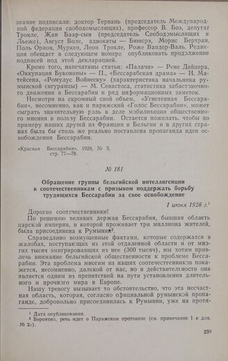 Обращение группы бельгийской интеллигенции к соотечественникам с призывом поддержать борьбу трудящихся Бессарабии за свое освобождение. 1 июня 1928 г. // «La Fédération Balcanique», № 93,1 июня 1928 г., стр. 1968. Перевод с французского языка.