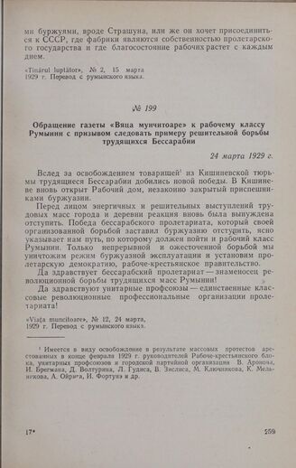 Обращение газеты «Вяца мунчитоаре» к рабочему классу Румынии с призывом следовать примеру решительной борьбы трудящихся Бессарабии. 24 марта 1929 г. // «Viața muncitoare», № 12, 24 марта, 1929 г. Перевод с румынского языка.