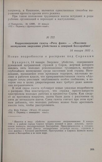Корреспонденция газеты «Роте фане» — «Массовое возмущение зверскими убийствами в северной Бессарабии». 14 января 1932 г. // «Die Rote Fahne» (Wien), 15 января 1932 г. Перевод с немецкого языка.