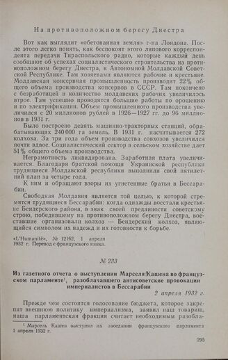 Из газетного отчета о выступлении Марселя Кашена во французском парламенте, разоблачавшего антисоветские провокации империалистов в Бессарабии. 2 апреля 1932 г. // «L’Humanité», № 12163, 2 апреля 1932 г. Перевод с французского языка.