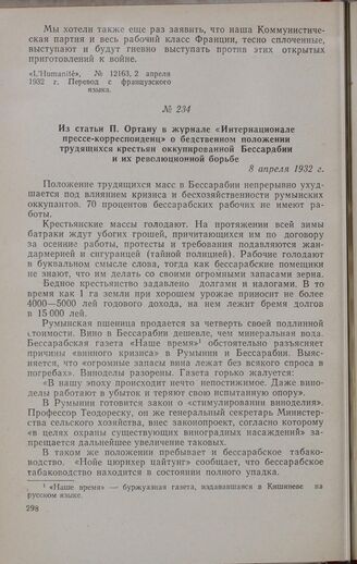 Из статьи П. Ортану в журнале «Интернационале прессе-корреспонденц» о бедственном положении трудящихся крестьян оккупированной Бессарабии и их революционной борьбе. 8 апреля 1932 г.