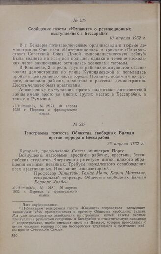 Телеграмма протеста Общества свободных Балкан против террора в Бессарабии. 26 апреля 1932 г. // «L’Humanité», № 12187, 26 апреля 1932 г. Перевод с французского языка.