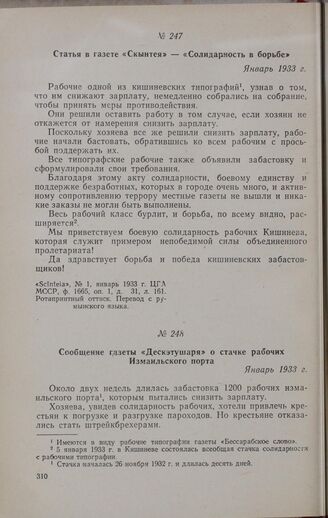 Статья в газете «Скынтея» — «Солидарность в борьбе». Январь 1933 г. // «Scînteia», № 1, январь 1933 г. ЦГА МССР, ф. 1665, оп. 1, д. 31, л. 161. Ротапринтный оттиск. Перевод с румынского языка.