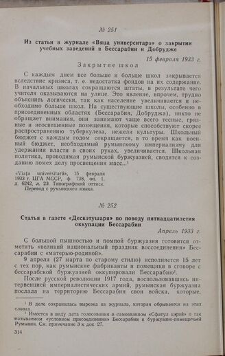 Из статьи в журнале «Вяца университарэ» о закрытии учебных заведений в Бессарабии и Добрудже. 15 февраля 1933 г. // «Viața universitară», 15 февраля 1933 г. ЦГА МССР, ф. 738, оп. 1, д. 6242, л. 23. Типографский оттиск. Перевод с румынского языка.