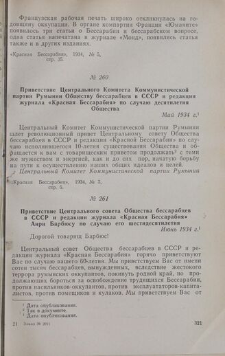 Приветствие Центрального Комитета Коммунистической партии Румынии Обществу бессарабцев в СССР и редакции журнала «Красная Бессарабия» по случаю десятилетия Общества. Май 1934 г. // «Красная Бессарабия», 1934, № 5, стр. 5.