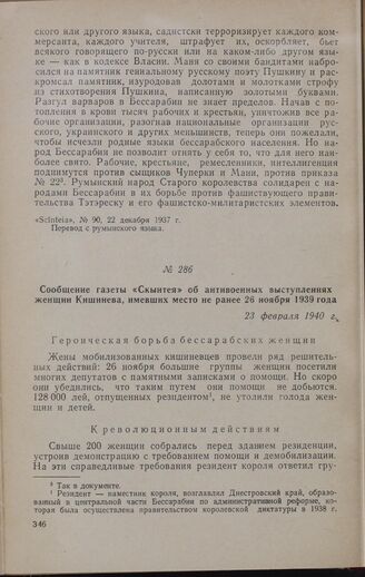 Сообщение газеты «Скынтея» об антивоенных выступлениях женщин Кишинева, имевших место не ранее 26 ноября 1939 года. 23 февраля 1940 г. // «Scînteia», № 27 (117), 23 февраля 1940 г. Перевод с румынского языка.