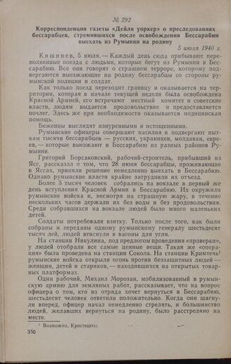 Корреспонденция газеты «Дейли уоркер» о преследованиях бессарабцев, стремившихся после освобождения Бессарабии выехать из Румынии на родину. 5 июля 1940 г. // «The Daily Worker» (USA), № 162, 6 июля 1940 г. Перевод с английского языка.