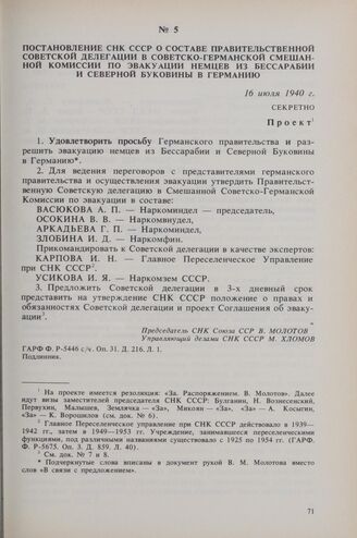 Постановление СНК СССР о составе правительственной советской делегации в Советско-германской смешанной комиссии по эвакуации немцев из Бессарабии и Северной Буковины в Германию. 16 июля 1940 г. // ГАРФ. Ф. Р-5446 с/ч. Оп. 31. Д. 216. Л. 1. Подлинник.